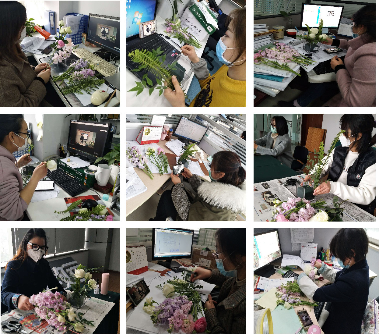大家在各自办公桌前剪枝、摘叶,按照老师分享的技巧,凭着对花的喜爱、对美的感受,巧手修剪、用心搭配,一盆盆独具匠心又饱含深意的插花作品伴着氤氲的芬芳纷至呈现。有的诗情画意,有的典雅格调,蕙质兰心,风格迥异,或直立、倾斜,展现着各具特色的美。女神们脸上都绽放开了美丽的笑容。