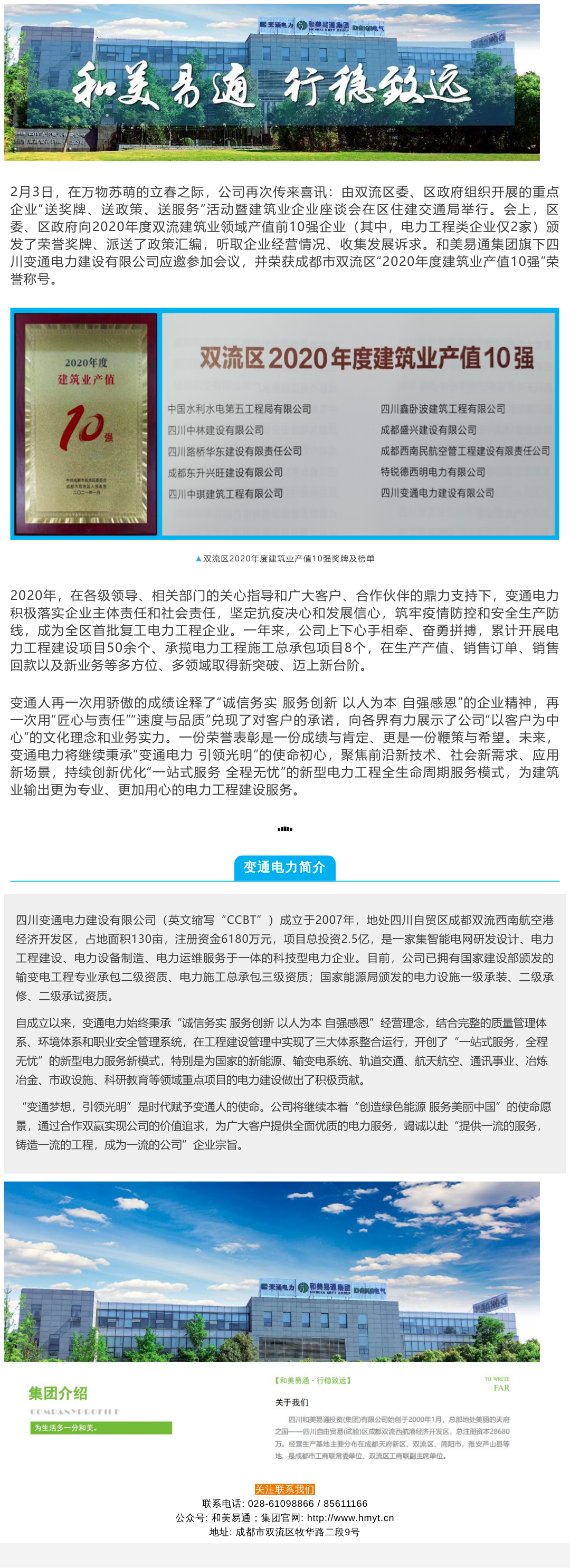 变通电力荣获成都市双流区“2020年度建筑业产值10强”荣誉称号